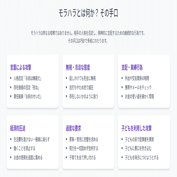 モラハラとはモラルハラスメントの略で、言葉や態度によって相手の心をじわじわと追い詰める精神的な暴力のことを指します。