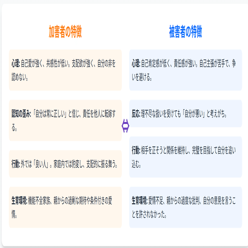 モラハラの加害者と被害者には明確な特徴があり、互いに「引き寄せ合う」相関関係が存在します。この関係は偶然ではなく、幼少期の家庭環境や学習された行動パターンによって形成されます。